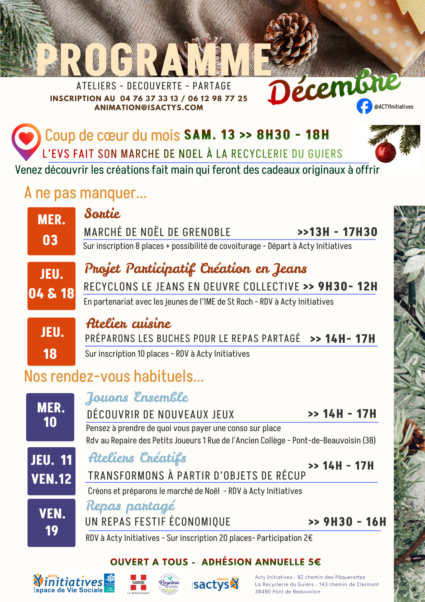 Acty Initiatives, l’Espace de Vie Sociale, vous présente son programme du mois de décembre qui va nous émerveiller. Découvrez nos activités pour finir l’année dans une ambiance conviviale et festive.